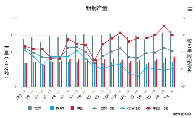 中国铁合金网讯:2019年5月全球64个纳入世界钢铁协会统计国家的粗钢产量为1.627亿吨,同比提高5.4%。