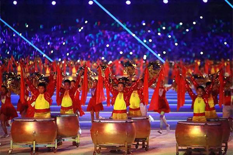 开幕式第一篇章“红日照东方”中,太钢威风锣鼓敲响了“激越时代”大型表演的序幕。两百面威风大鼓,两百名钢铁男儿,列阵汾水两岸。鼓声激越,威武雄壮,太钢威风锣鼓与激流勇进的航船,共同描绘奔向新时代的美丽画卷。