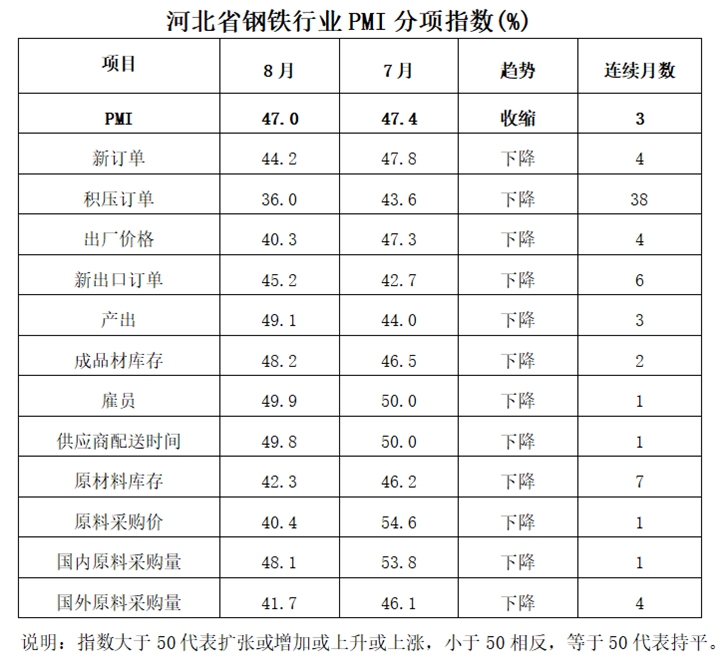 中国铁合金网讯:2019年9月1日河北省冶金行业协会发布2019年8月份河北省钢铁行业PMI为47.0%,环比回落0.4个百分点。