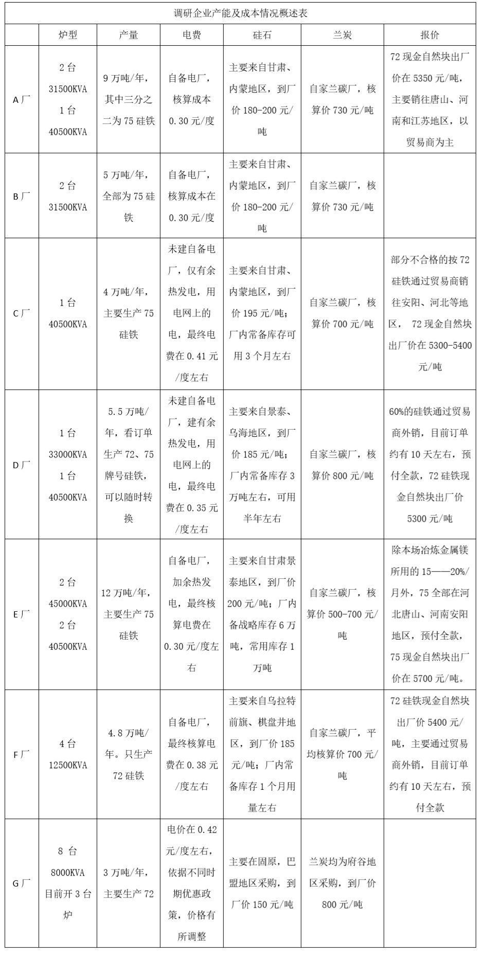 根据上文供需数据显示,陕西地区75牌号硅铁已达到饱和状态,后续或持续出现供大于求的状态。调研期间,多家硅铁厂家领导同样表示担忧,对后期硅铁市场较为悲观,但因为兰炭—硅铁—金属镁循环产业链的需要,轻易不会停产,而是除满足自家炼镁生产需求外,生产72牌号硅铁(转换较为便捷),自然块,通过贸易商流向全国市场。