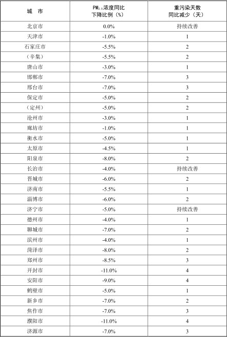 主要目标:稳中求进,推进环境空气质量持续改善,京津冀及周边地区全面完成2019 年环境空气质量改善目标,协同控制温室气体排放,秋冬季期间(2019 年 10 月 1 日至 2020 年 3 月 31 日)PM 2.5 平均浓度同比下降5.5%,重度及以上污染天数同比减少8%(详见附表1)。