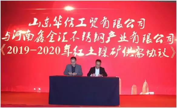 致辞结束后,在众多嘉宾和媒体的见证下,山东华信工贸有限公司与河南鑫金汇不锈钢产业有限公司举行了隆重的签约仪式,签订《2020年红土镍矿供需协议》,标志着河南鑫金汇不锈钢产业有限公司与山东华信工贸集团的合作迈入更高的台阶。