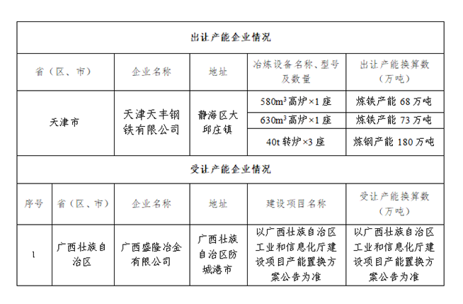中国铁合金网讯:按照《国务院关于化解产能严重过剩矛盾的指导意见》 《国务院关于钢铁行业化解过剩产能实现脱困发展的意见》和《钢铁行业产能置换实施办法》要求,现将天津市天丰钢铁有限公司钢铁产能出让情况予以公示,欢迎社会公众进行监督。