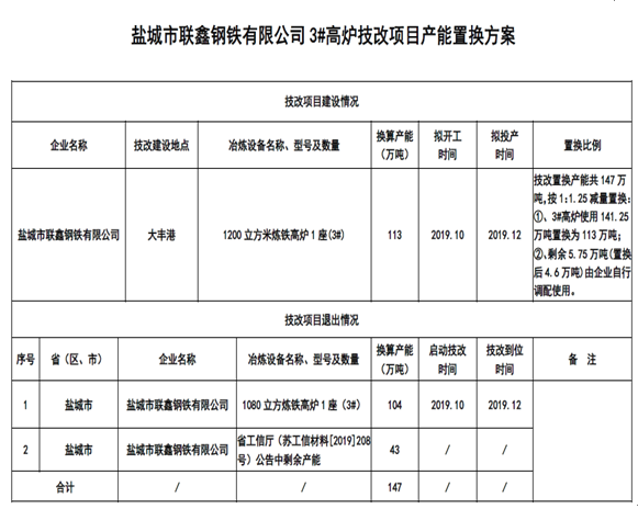 【中国铁合金网讯】根据《国务院关于化解产能严重过剩矛盾的指导意见》《国务院关于钢铁行业化解过剩产能实现脱困发展的意见》和《工业和信息化部关于印发钢铁水泥玻璃行业产能置换实施办法的通知》有关规定,我厅于2019年11月5日至11月12日对盐城市联鑫钢铁有限公司3#高炉技改项目产能置换方案进行了公示,公示期间未收到异议。现予以公告,欢迎社会公众监督。