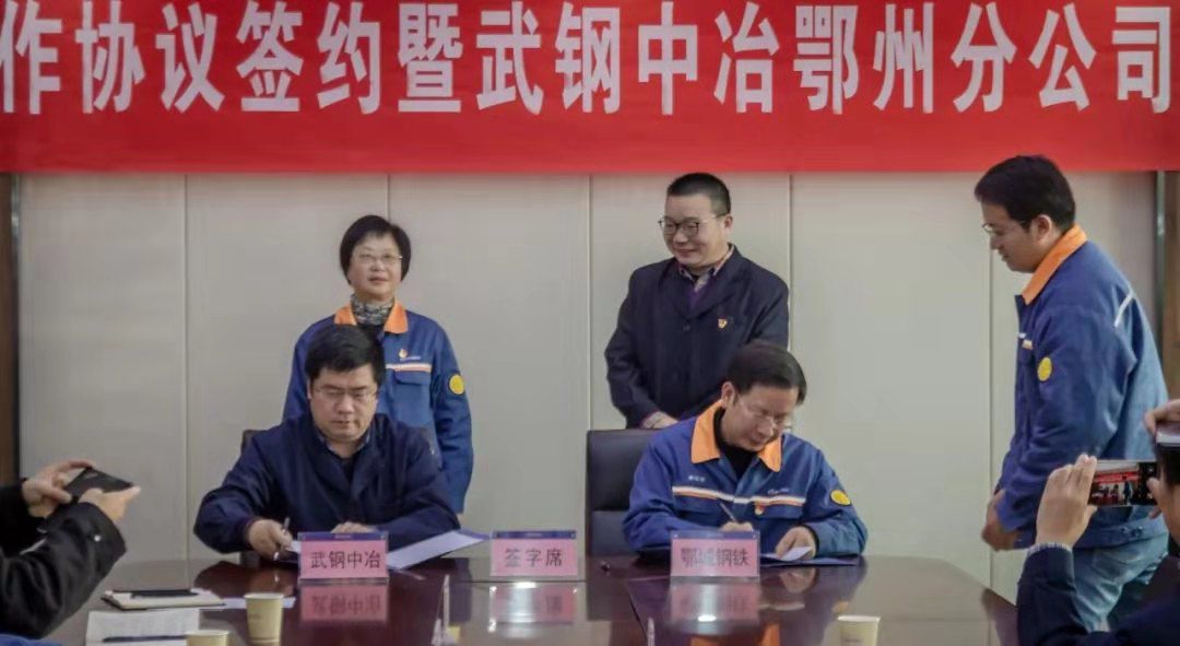 【中国铁合金网讯】11月29日上午,鄂城钢铁与武钢中冶战略合作协议签约暨武钢中冶鄂州分公司揭牌仪式在公司办公楼四楼会议室举行。在鄂城钢铁党委书记、董事长王素琳,武钢中冶党委书记、董事长张文辉的见证下,鄂城钢铁总裁、党委副书记赖晓敏,武钢中冶总经理董朔代表双方企业签署战略协议。