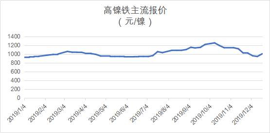 今年年初,由于春节临近,市场对于镍铁需求不足,因此在1月份绝大多数时间,镍铁价格相对处于低位。但由于月底伦镍价格有所上涨,且304系列不锈钢价格有所上扬,使得镍铁价格开始有所上涨,另外2月份春节结束后,不锈钢开始恢复生产,镍铁新增产能速度不及不锈钢增产速度,这使得镍铁价格一路看涨,另外内蒙限电措施也抑制了镍铁产能增速,使得镍铁价格居高不下。随着不锈钢产量的提高,市场对于镍铁需求有所削弱,这使得镍铁价格自3月中旬起上涨势头有所遏制。另外,随着越来越多的镍铁产能投入生产,镍铁价格有所回落。 自4月起,高镍铁价格降到1000元/镍以下。这种情况一直持续到7月,随着镍矿供应的不足,不锈钢行情再度看涨,镍铁价格再度上涨,高镍铁价格一度攀升到1260元/镍以上。随着菲律宾解除部分镍矿企业出口禁令,自10月起,高镍铁价格开始回落到1200元/镍以下。随着11月份印尼镍矿出口禁令的解除,高镍铁价格进一步回落。目前,高镍铁价格维持在1000元/镍左右。低镍铁价格相对稳定。
