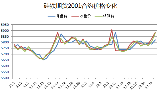 【期货行情】本周硅铁期货2001合约开盘价5812,最高价5900,最低价5742,收盘价5886,涨幅1.24%,结算价5880,成交总量6.73万手,持仓量29956。