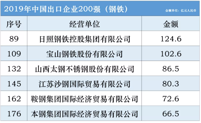 在2019年中国出口企业200强中,共有6家钢铁企业,具体整理如下表: