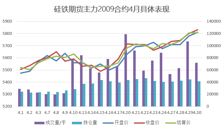 【期货行情】本月硅铁期货盘面上涨,2009合约开盘价5474,最高价5864,最低价5452,收盘价5830,结算价5808,持仓量41345,成交量1294992。