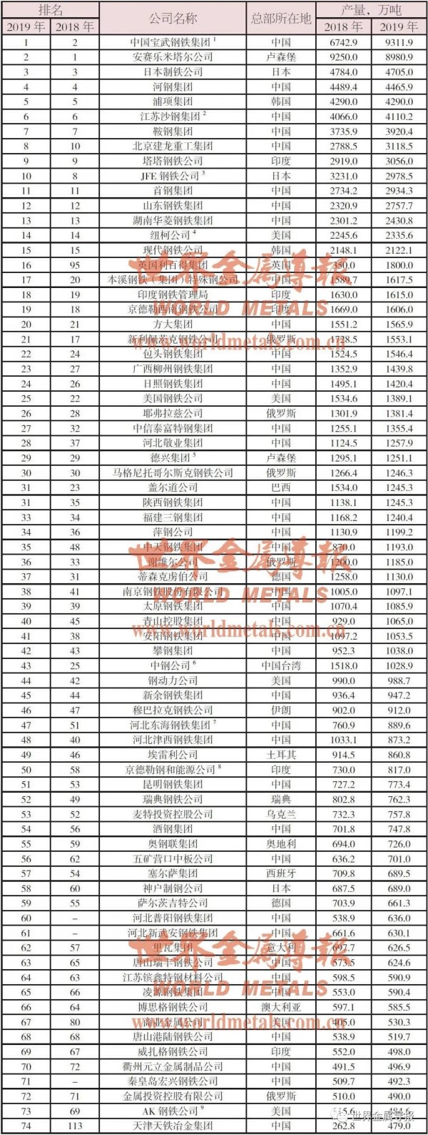 2019年全球钢铁企业