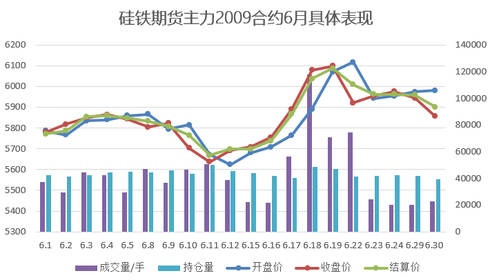 【期货行情】本月硅铁期货2009合约开盘价5,786,最高价6,176,最低价5,614,收盘价5,856,结算价5,900,持仓量39,340,成交量856,098。