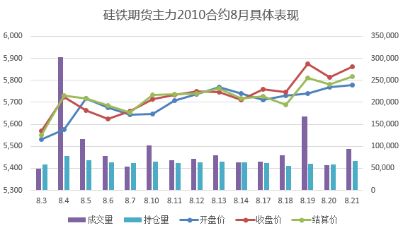 【期货行情】本周硅铁期货盘面小幅攀升,交割库去库缓慢,临近交割月,观望情绪浓。本周硅铁期货主力2010合约开盘价5,710,最高价5,876,最低价5,652,收盘价5,824,结算价5,816,持仓量66,505,成交量463,165。