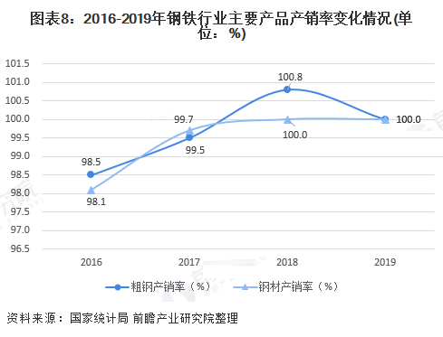 根据国家统计局数据,2016-2019年主要钢铁产品的产销率呈上升趋势,2019年中国粗钢和钢材的产销率均为100%。这主要是由于各地不断推进去产能和产能置换的进程,钢铁行业供给侧改革成效逐渐显现所致。