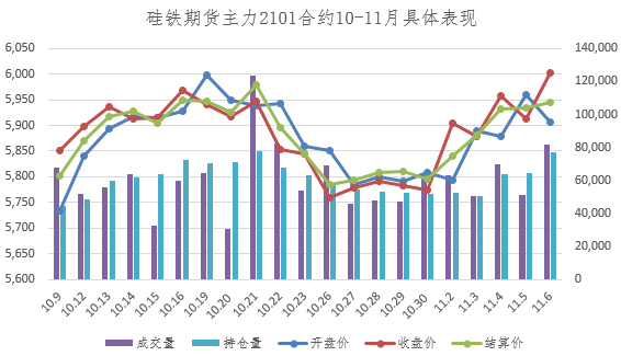 【期货行情】11月首周,硅铁期货盘面回升飘红。硅铁期货主力2101合约开盘价5,794,最高价6,006,最低价5,782,收盘价6,002,结算价5,944,成交量316,736,持仓量77,372。