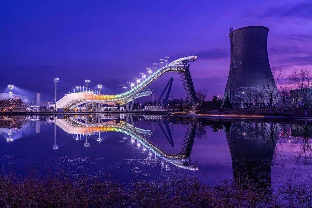 不过园内的改造还没完全落成,已建成了约三分之一的面积,尽管大多数地方仍然满目沧桑,但比起之前的荒芜,多了几分色彩和热闹。在群明湖畔,4座威然矗立的冷却塔旁,首钢滑雪大跳台光彩照人,从远处看,好似一条飞天的飘带。夜幕下,跳台赛道晶莹剔透,建筑侧影色彩斑斓。