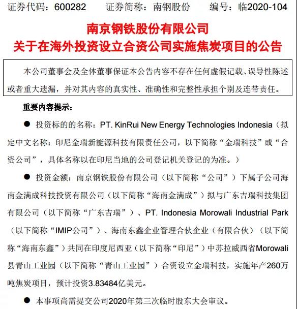 11 月 18日,南钢股份公布,该公司下属子公司海南金满成科技投资有限公司(“海南金满成”)拟与广东吉瑞科技集团有限公司(“广东吉瑞”)、PT. Indonesia Morowali Industrial Park(“IMIP公司”)、海南东鑫企业管理合伙企业(有限合伙)(“海南东鑫”)共同在印度尼西亚(“印尼”)中苏拉威西省Morowali县青山工业园(“青山工业园”)合资设立金瑞新能源科技有限责任公司(以下简称金瑞科技),实施年产260万吨焦炭项目,预计投资3.83484亿美元。