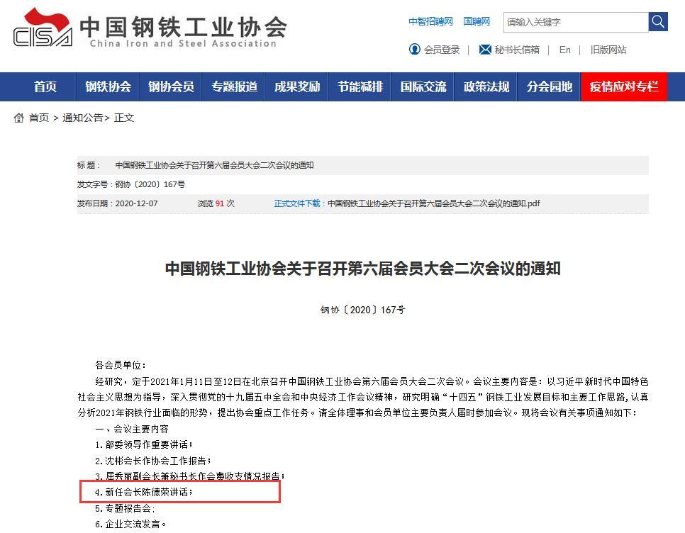 ??12月7日,中国钢铁工业协会发布关于召开第六届会员大会二次会议的通知,会议内容第4项为新任会长陈德荣讲话,这就意味着陈德荣将成为新任中国钢铁工业协会会长!现任会长为沙钢集团董事长、党委书记沈彬。
