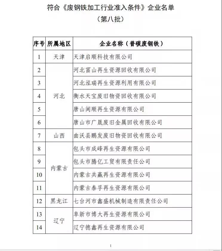 昨日,根据《废钢铁加工行业准入条件》等规范条件及相关公告管理办法规定,工信部节能与综合利用司将拟公告的符合《废钢铁加工行业准入条件》企业名单(第八批)公示。此次公示的废钢基地准入企业(普碳废钢)共计100家,主要分布于广东、湖北、山东、福建、江西、江苏等省份。