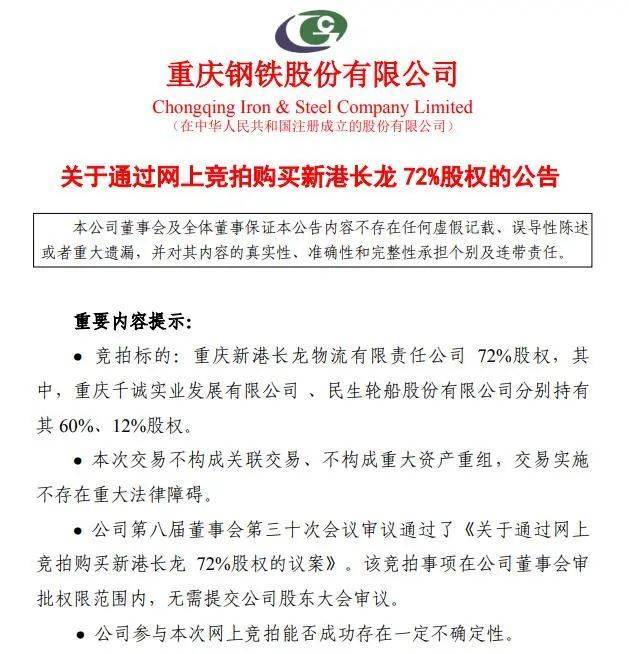 此前,重庆钢铁已经持有新港长龙28%的股权。若此次网上竞拍72%的股权成功,那么重庆钢铁将100%持股新港长龙。