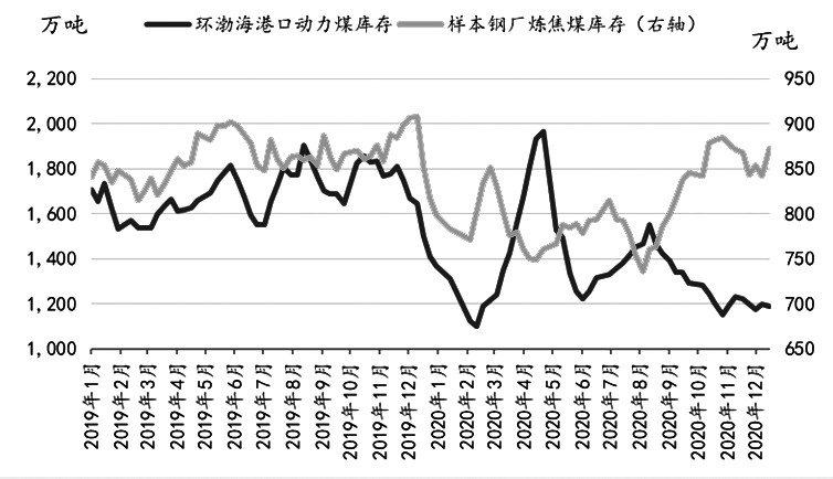 图为环渤海港口动力煤、样本钢厂煤焦煤库存