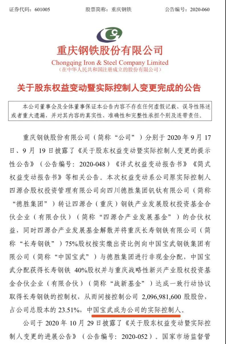 12月3日晚间,重庆钢铁发布公告,公司控股股东——重庆长寿钢铁有限公司于12月2日完成工商登记变更,变更后中国宝武钢铁集团持股40%,四川德胜集团钒钛有限公司持股35%,重庆战略性新兴产业股权投资基金合伙企业(有限合伙)持股25%。中国宝武与重庆战新基金达成一致行动协议取得长寿钢铁的控制权,从而间接控制重庆钢铁约20.97亿股,占公司总股本的23.51%,中国宝武正式成为公司实际控制人。