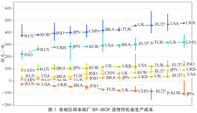 欧盟27国采用BF-BOF流程生产热轧卷的平均成本较高的原因在于所有主要成本要素均处于较高位置: