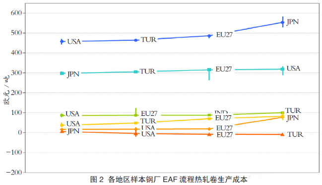 欧盟27国采用电炉流程生产热轧卷的平均成本居第二位(486欧元/吨),仅次于日本(554欧元/吨)。但是,与所有其他国家电炉流程热轧卷生产成本都非常相近(图2)。与BF-BOF生产流程相比,由于能源成本更高以及副产品收益较低,电炉流程生产热轧卷的成本通常更高。具体分析如下:
