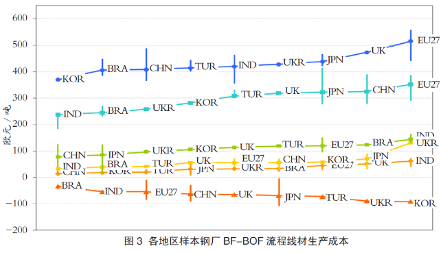 2)欧盟27国采用BF-BOF流程生产线材的人工成本高居第三位(44欧元/吨),其他成本(119欧元/吨)同样列第三位,其中CO2成本为8欧元/吨。