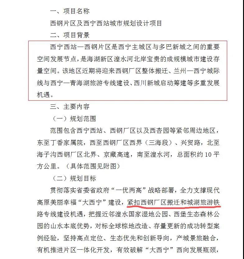 2020年10月12日,青海省政府采购网发布的《西钢片区及西宁西站城市规划设计项目公开招标公告》就曾指出:西宁西站—西钢片区是西宁主城区与多巴新城之间的重要空间发展节点,是海湖新区湟水河北岸宝贵的成规模城市建设存量空间。该地区近期将迎来西钢厂区整体搬迁、兰州—西宁城际线与西宁—青海湖旅游专线建设、西川新城启动筹建等多重发展机遇。