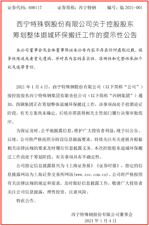 中国铁合金网讯:2021年1月4日,西宁特殊钢股份有限公司(以下简称“公司”)接控股股东西宁特殊钢集团有限责任公司通知,西宁特钢正在筹划整体退城环保搬迁工作,该事项尚处于前期论证阶段,有关方案尚未确定,后续亦需获得相关主管部门履行决策审批程序。