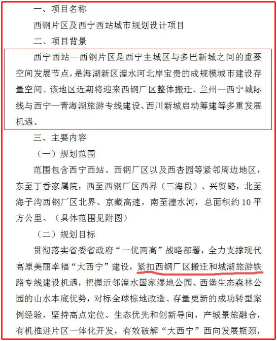 2020年10月12日,青海省政府采购网发布的《西钢片区及西宁西站城市规划设计项目公开招标公告》就曾指出:西宁西站—西钢片区是西宁主城区与多巴新城之间的重要空间发展节点,是海湖新区湟水河北岸宝贵的成规模城市建设存量空间。该地区近期将迎来西钢厂区整体搬迁、兰州—西宁城际线与西宁—青海湖旅游专线建设、西川新城启动筹建等多重发展机遇。