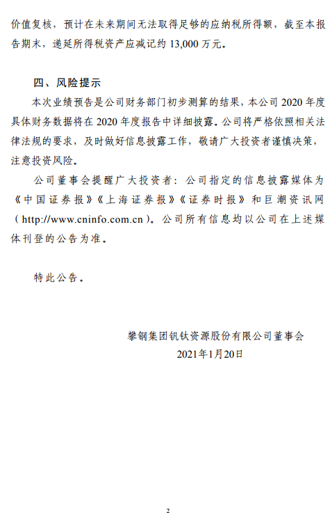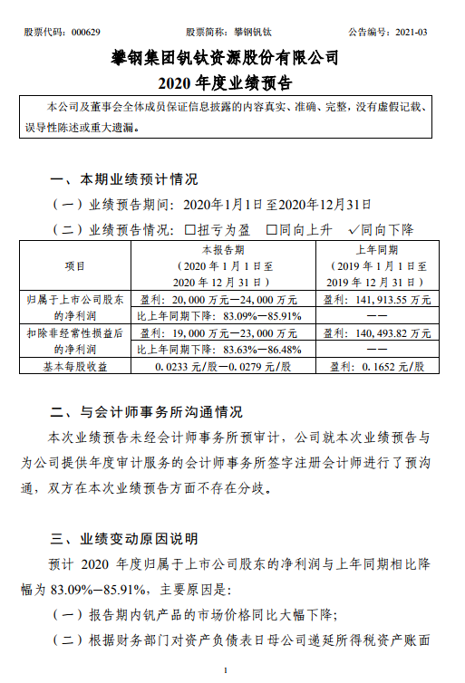 近日,攀钢钒钛发布2020年业绩预告,预计2020年净利润为2亿-2.4亿元,同比下降83.09%-85.91%。报告期内钒产品的市场价格同比大幅下降。