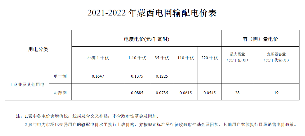 中国铁合金网讯:年底内蒙古发改委会发布关于蒙西电网2020-2022年输配电价和销售电价有关事项的通知,具体工商业用电如下所示,通知自2021年1月1日起执行,其中文件显示降低蒙西电网工商业及其他用电目录销售电价。单一制不满1千伏、1-10千伏、35-110千伏目录销售电价每千瓦时分别降低3.12分、2.45分、1.78分;两部制各电压等级目录销售电价每千瓦时均降低4.5分,具体电价如下所示: 单位:元/千瓦时