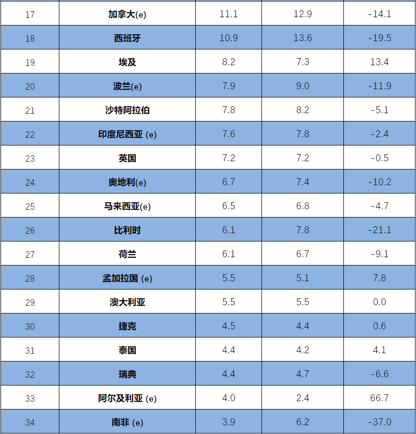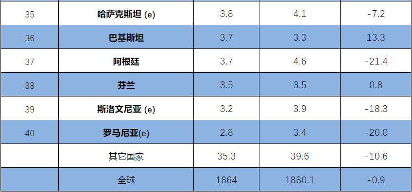 2020年全球钢铁产量排名如下(单位:百万吨):