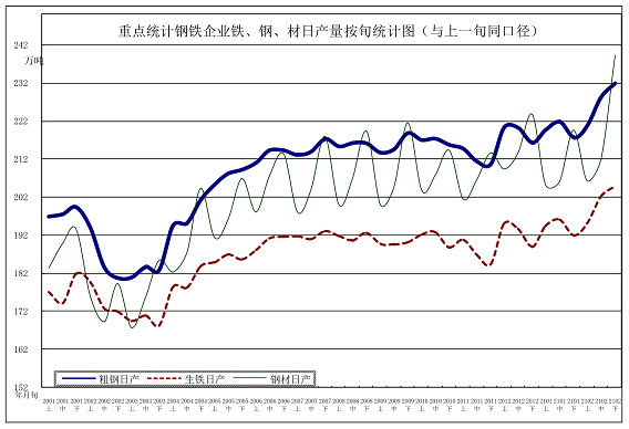 本月重点统计钢铁企业累计平均日产粗钢226.06万吨,环比增长1.54%、同比增长17.20%;生铁199.79万吨,环比增长2.59%、同比增长10.28%;钢材217.49万吨,环比增长3.12%、同比增长20.24%。