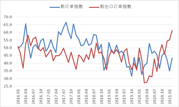 2月份,随着春节假期结束,经济运行逐步回归正常,基建开始逐步发力,加上钢铁行业“金三银四”传统旺季即将到来,国内钢铁市场需求趋于改善,钢贸商订货回暖。新订单指数为43.3%,环比上升8.3个百分点。外部需求方面,随着各主要经济体疫情防控力度加大,财政刺激政策不断推出,其经济持续恢复,带动钢铁需求上升,我国钢材出口量继续增加。新出口订单指数为61.4%,环比上升6.2个百分点,连续4个月环比上升。