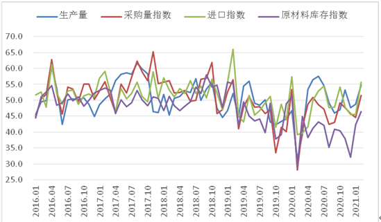 图4 2016年以来生产指数、采购量指数、进口指数和原材料库存指数变化情况