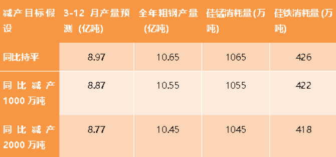 无论是从碳排放量的差异来看,还是从产能置换比例的不同来看,政策端都是倡导电弧炉炼钢的。而如果严格按照工信部同比持平甚至压减1000-2000万吨的政策预期来执行。下表中,我们(基于调升后的年度基数)按照粗钢压减的不同任务程度,毛估出硅锰和硅铁产量的对应压减量。