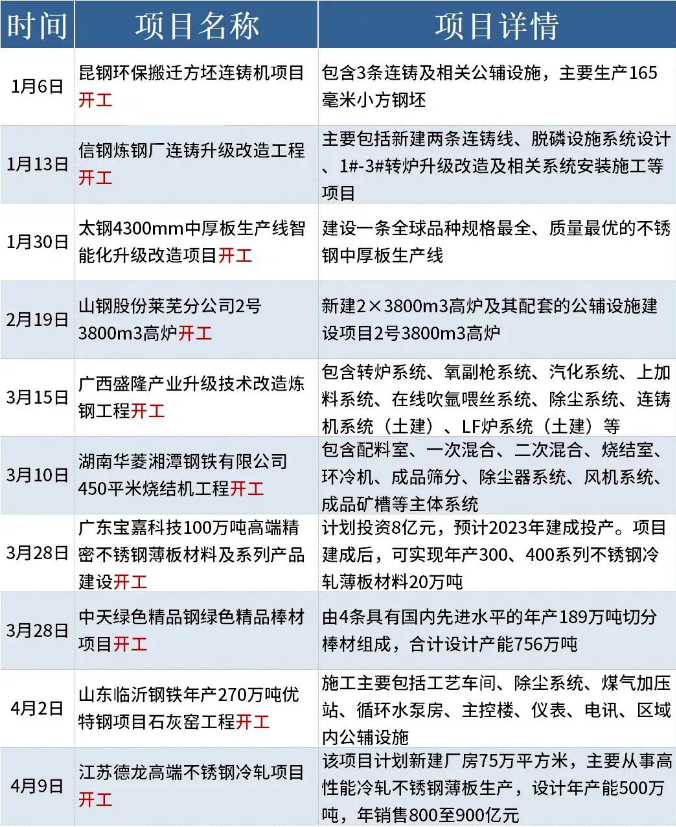 其中,开工项目共11个,涉及江苏德龙高端不锈钢冷轧项目开工和中天绿色精品钢绿色精品棒材项目开工等。