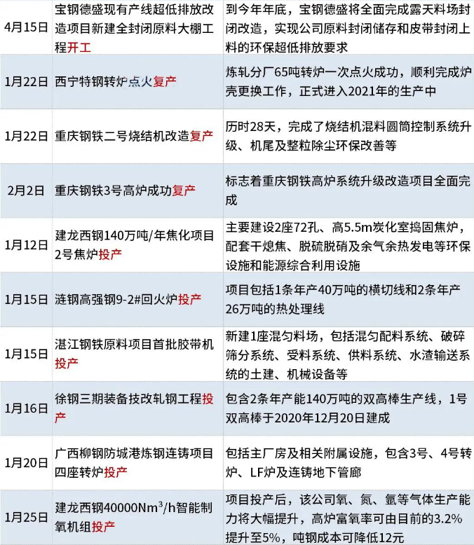 投产项目共16个,涉及河钢乐亭钢铁公司3号高炉投产和宁钢1580高炉项目建成投产等。