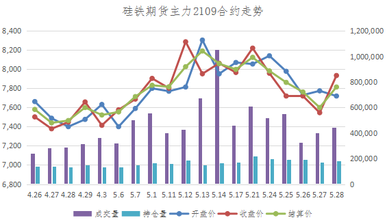 【期货行情】进入5月,期货盘面持续拉涨,虽然最后一周有所下行,但临近月底又迅速回升。5月28日硅铁期货2109合约开盘价7,720,最高价7,944,最低价7,684,收盘价7934,成交量444,380,持仓量183,651,结算价7,814,涨幅4.39%。