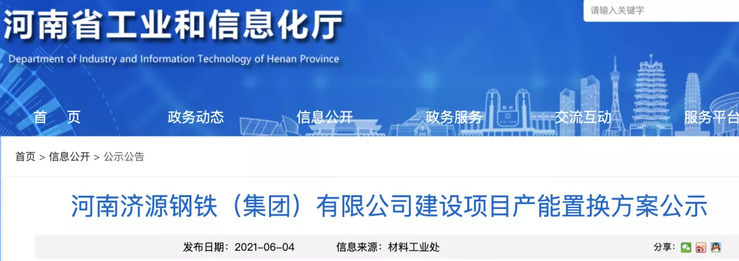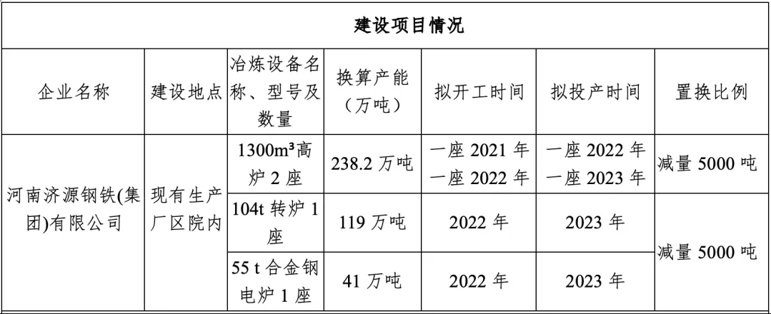 按照《国务院关于化解产能严重过剩矛盾的指导意见》、《国务院关于钢铁行业化解过剩产能实现脱困发展的意见》和《钢铁行业产能置换实施办法》(工信部原〔2017〕337号)要求,我厅于2020年1月13日发布了河南济源钢铁(集团)有限公司建设项目产能置换方案公示。公示期间,国家发展改革委办公厅、工业和信息化部办公厅联合发布《关于完善钢铁产能置换和项目备案工作的通知》(发改电〔2020〕19号),该项目产能置换方案公示暂停。根据工业和信息化部2021年4月17日印发的《钢铁行业产能置换实施办法》(工信部原〔2021〕46号)第十五条以及《钢铁行业产能置换实施办法》解读第八条,现将河南济源钢铁(集团)有限公司建设项目产能置换方案继续公示。