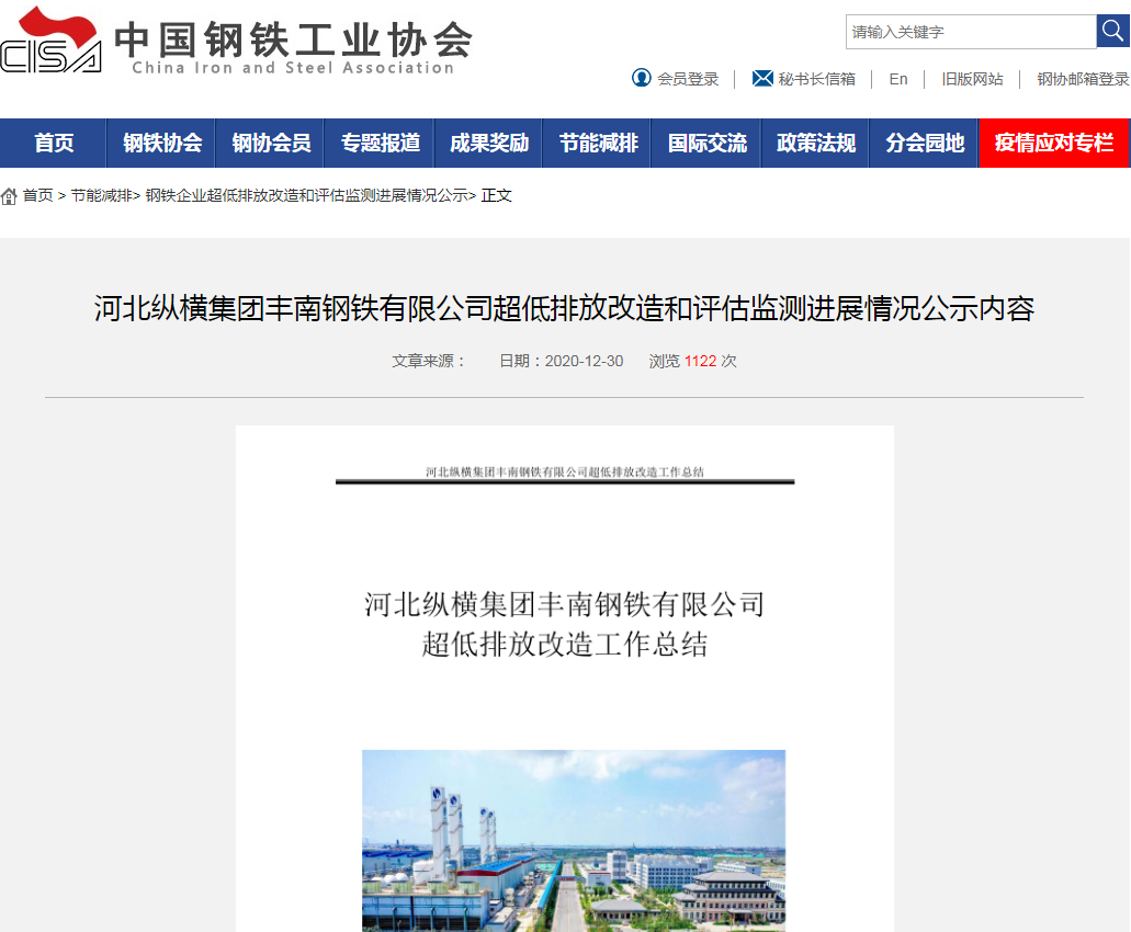 2020年12月份,公司在中国钢铁工业协会网站上完成了超低排放改造和评估监测公示,成为国内第八家、唐山市民营钢铁企业第一家率先完成全工序超低排放改造和评估监测的钢铁企业,有组织和无组织管控整体达到了超低排放水平。
