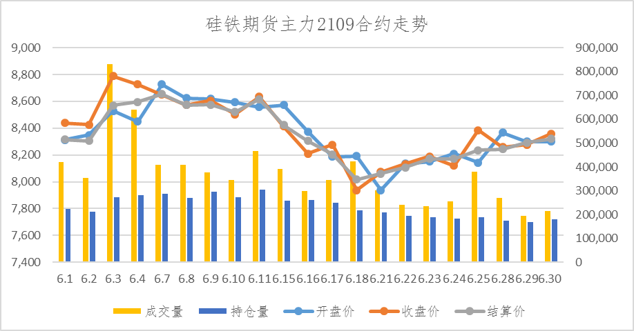 【期货行情】本月硅铁期货盘面高位波动。2109主力合约开盘价8,312,最高价8,788,最低价7,902,收盘价8,358,结算价8,320,成交量7,796,248,持仓量179,932。