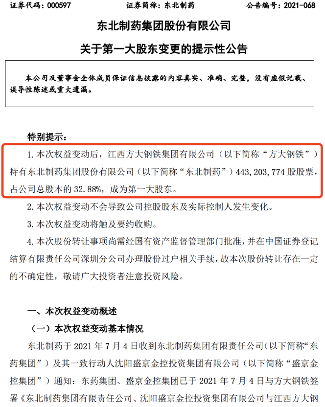 中国铁合金网讯:东北制药发布公告,东药集团与盛京金控集团以总价12.51亿元,将其合计持有的公司18.91%股权转让给方大钢铁。转让后,方大钢铁持股比例32.88%,成为公司第一大股东。方大钢铁为公司控股股东辽宁方大集团实业有限公司全资子公司,此次此次权益变动不会导致公司控股股东及实控人变化。