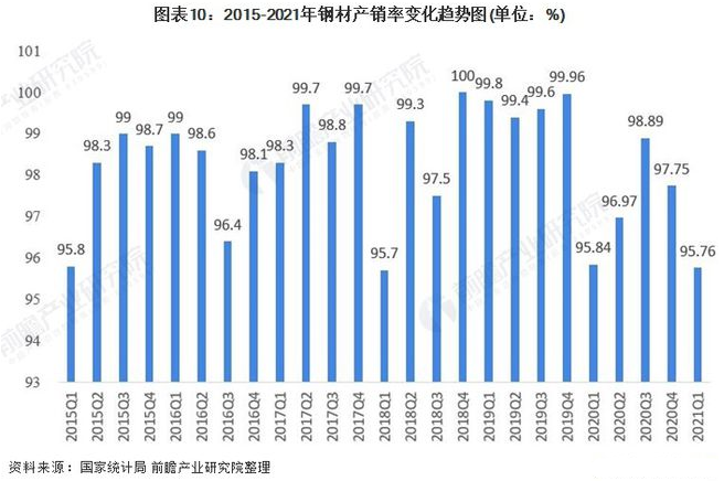 2010年,随着钢铁行业的复苏,钢材产能逐渐提高,产销率出现下滑,2015-2020年中国钢铁行业产销率在95%-100%之间波动,供需基本平衡。