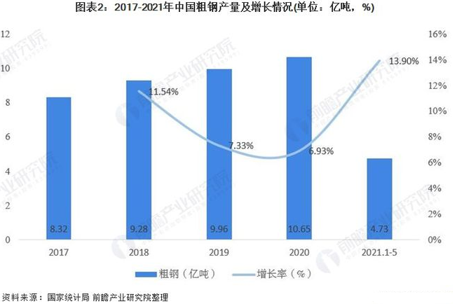 国家统计局数据显示2017-2020年我国粗钢产量不断增加,由2017年8.32亿吨增加至2020年的10.65亿吨,复合增长率达到4.55%,2021年1-5月,全国累计生产粗钢4.73亿吨,同比增长13.90%