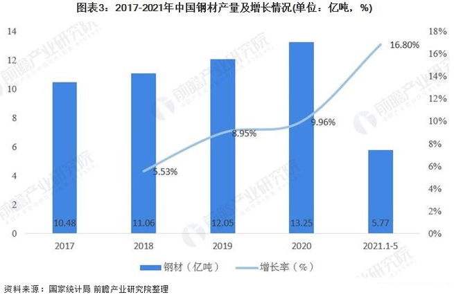 钢材是国家建设和实现四化必不可少的重要物资,其应用广泛、品种繁多,根据断面形状的不同、钢材一般分为型材、板材、管材和金属制品四大类,国家统计局数据显示2017-2020年我国钢材产量不断增加,由2017年10.48亿吨增加至2020年的13.25亿吨,复合增长率达到8.13%,2021年1-5月,全国累计生产钢材5.77亿吨、累计同比增长16.80%。
