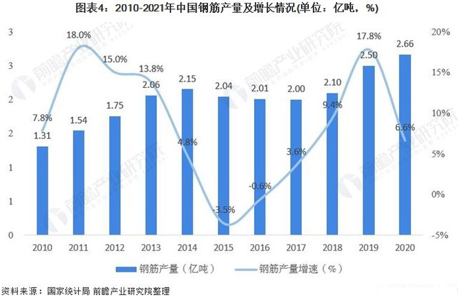 钢筋是指钢筋混凝土用和预应力钢筋混凝土用钢材,是我国钢材产销量最大的单个品种。2013年来,随着公路、铁路、桥梁、水坝等公用设施以及房屋建筑市场需求放缓,我国钢筋产量逐渐趋于稳定,每年基本维持在2亿吨左右。2019年中国钢筋市场回暖,产量同比增长17.8%至24972万吨,2020年全国钢筋产量为26625.3万吨,累计增长6.6%。
