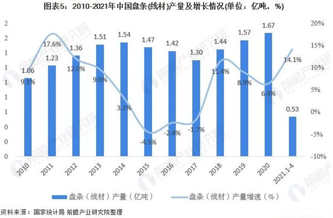 从国内线材消费情况看,线材在建筑领域中的应用较多,受国内投资需求旺盛形势的拉动,国内线材消费也随之保持较快增长。2019年我国线材(盘条)产量累计值达15682万吨,期末产量比上年累计增长8.9%;2020年,线材(盘条)产量达16655.6万吨,同比增长6.4%。